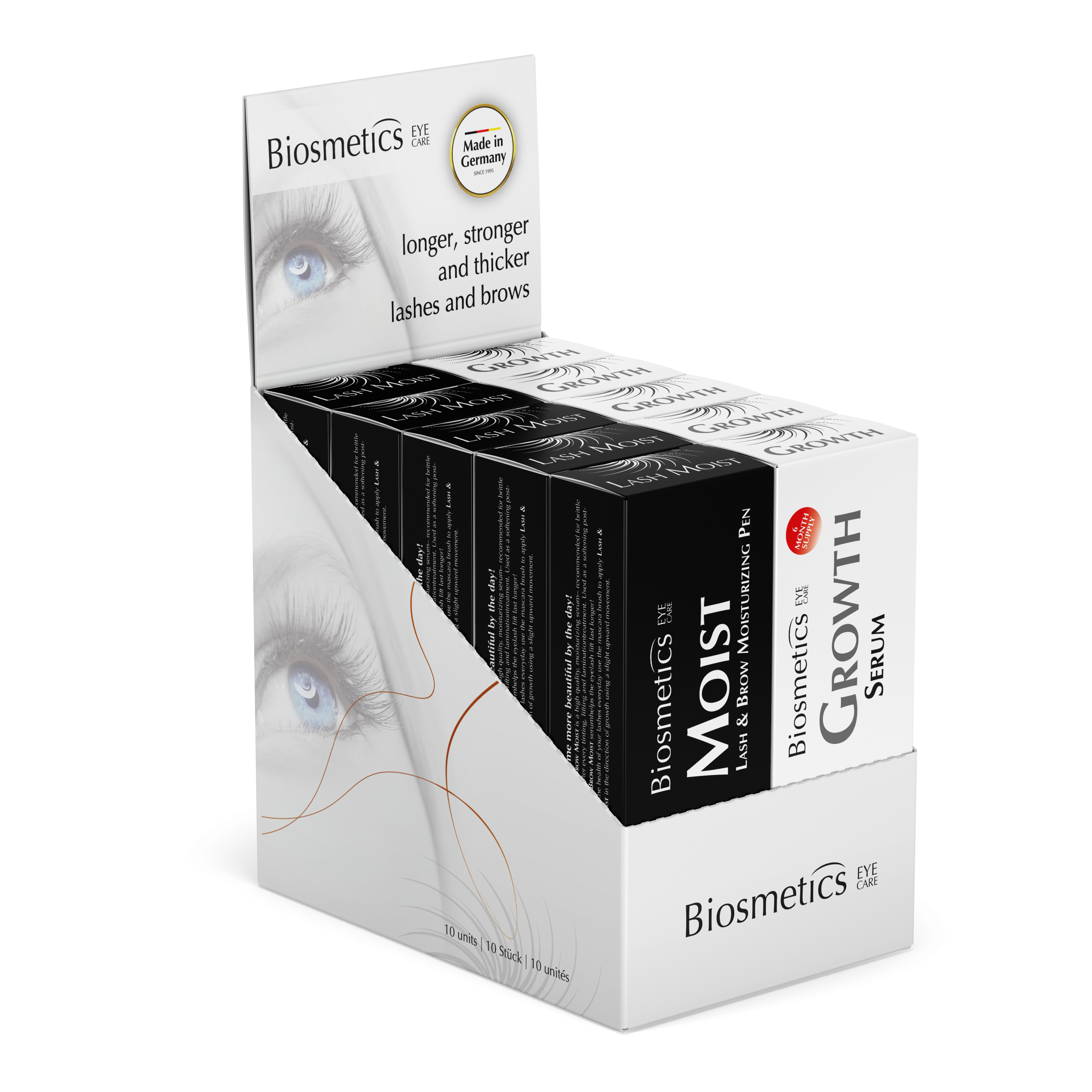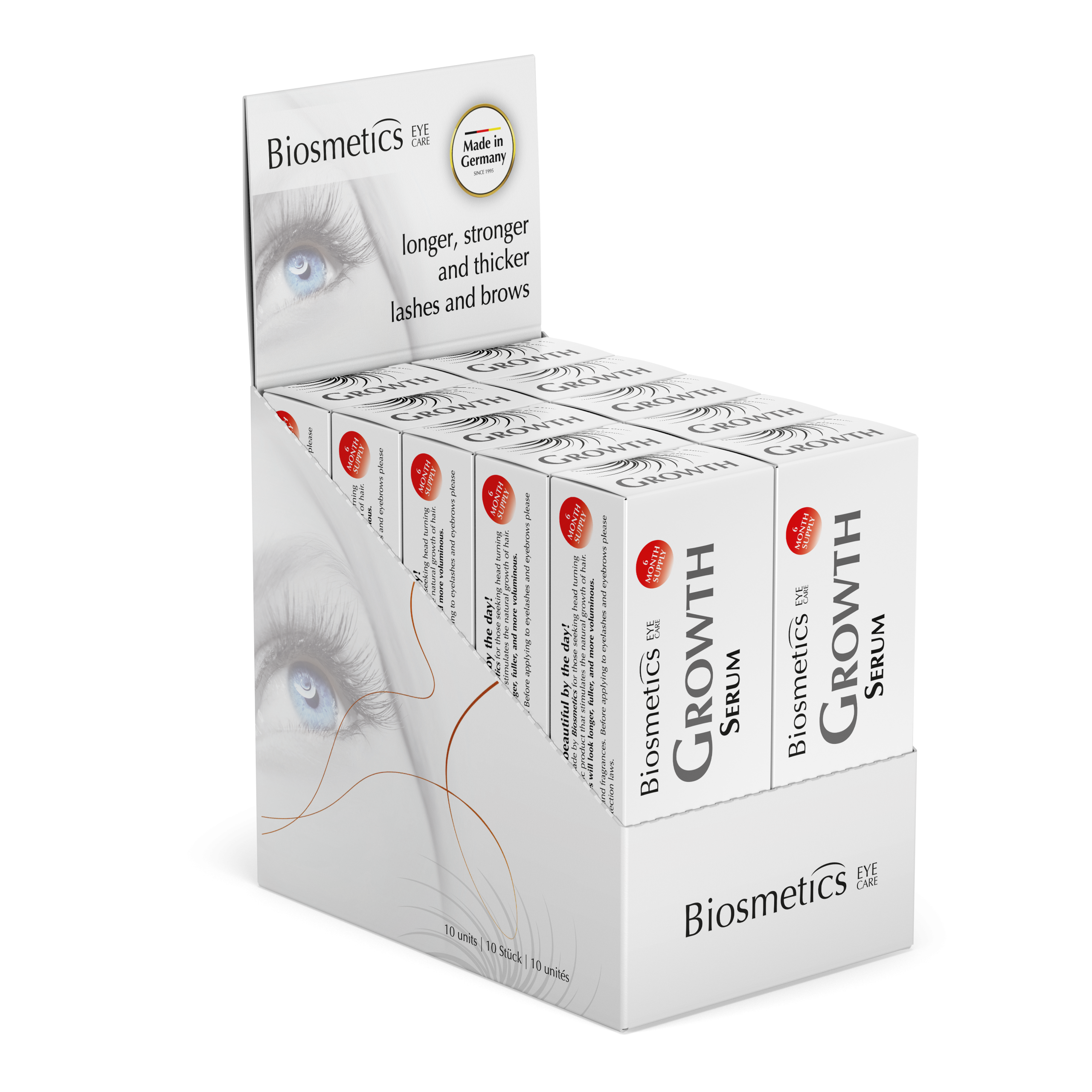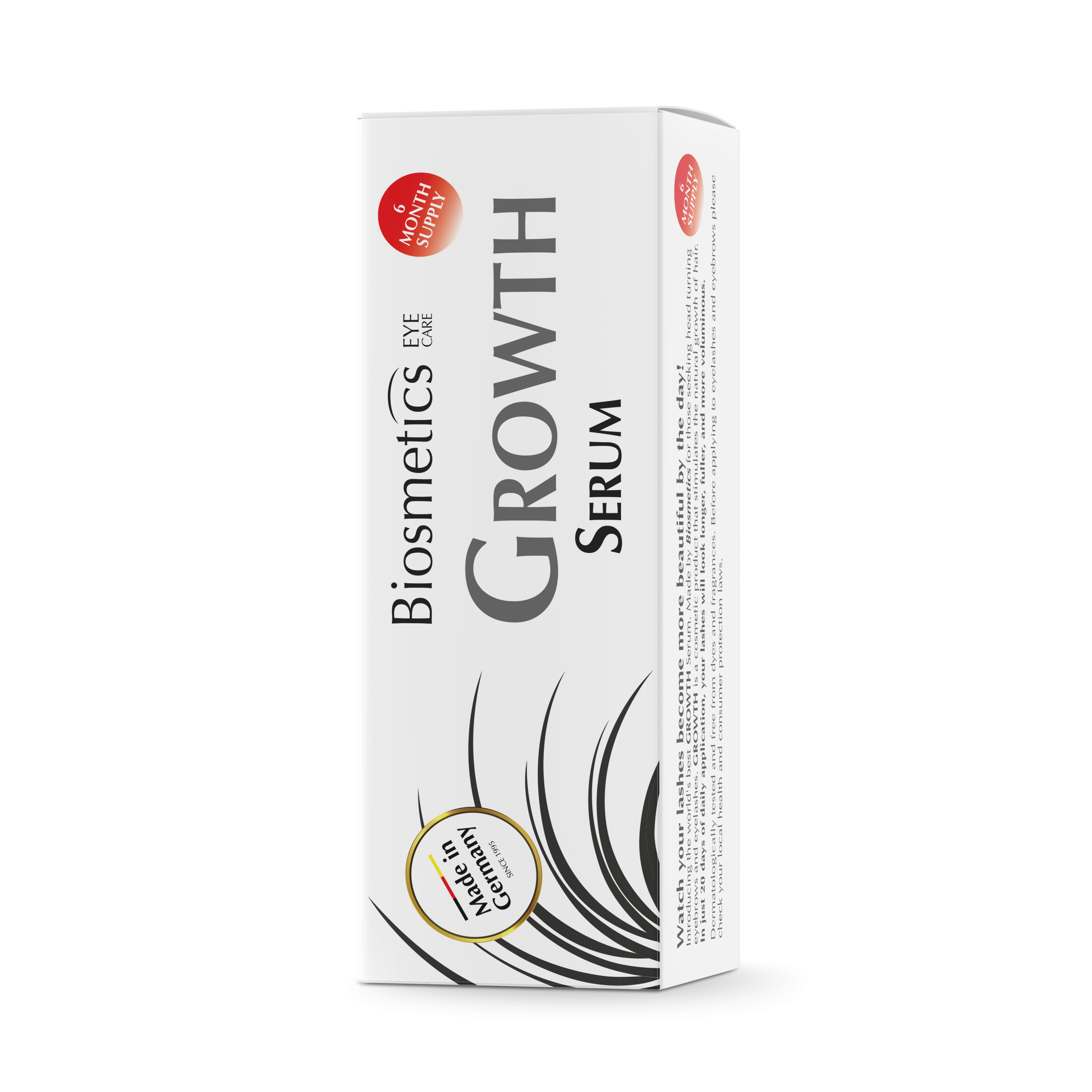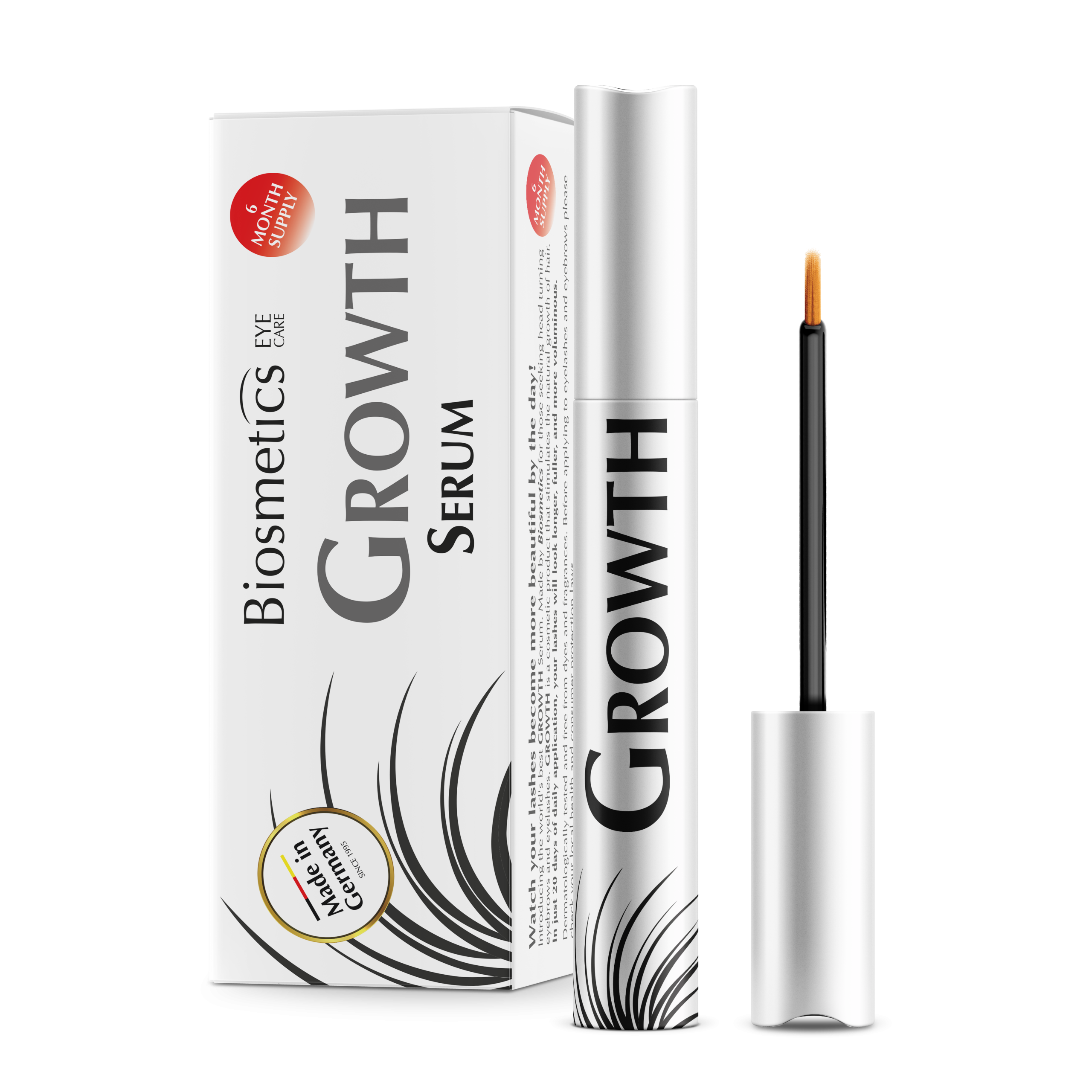 Our Biosmetics GROWTH Serum is a cosmetic product that stimulates the natural growth of hair. GROWTH Serum stimulates the hair’s roots and extends the growth phase while delaying hair loss. Eyelashes and eyebrows gain fullness, thickness and length.